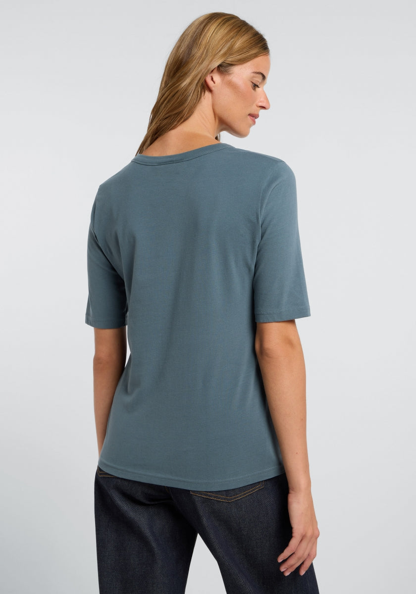 Het Elbsand Siva T-shirt is een nauwsluitend, stijlvol basic T-shirt voor dames. Het bestaat uit een zachte, elastische Single Jersey kwaliteit met 95% katoen en 5% elastaan, en biedt daardoor een prettig draagcomfort en een perfecte pasvorm. Het T-shirt heeft een klassieke ronde hals en halflange mouwen, waardoor het veelzijdig gedragen kan worden in elk seizoen. Een subtiele, zachte rubberprint op de borst zorgt voor een fijne, ingetogen accent. Het Siva T-shirt combineert minimalistische stijl met hoogwaardige afwerking en is ideaal voor dames die comfort en modieus design waarderen. Wasvoorschriften: machinewas op 30 graden, fijnwasprogramma, niet geschikt voor de droger.