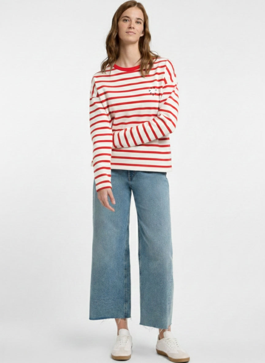 Ons Elbsand Elva Sweatshirt is een losvallend sweatshirt van zachte, elastische tricotkwaliteit met een modern streeppatroon. Het sweatshirt heeft een ronde hals met geribbelde boord, licht overlopende schouders en rechte mouwuiteinden. Een kleine ronde rubberprint op de borst geeft het ontwerp een subtiel herkenningselement. Dit sweatshirt combineert comfort en stijl en is ideaal voor dagelijks gebruik, vrije tijd, thuiswerken of weekendwandelingen. Het is gemaakt van 95% katoen en 5% elastaan en biedt een comfortabele pasvorm met een losse fit die veelzijdig te combineren is. Wasinstructies adviseren machinewas op 30 graden fijnwasprogramma, niet geschikt voor de droger.