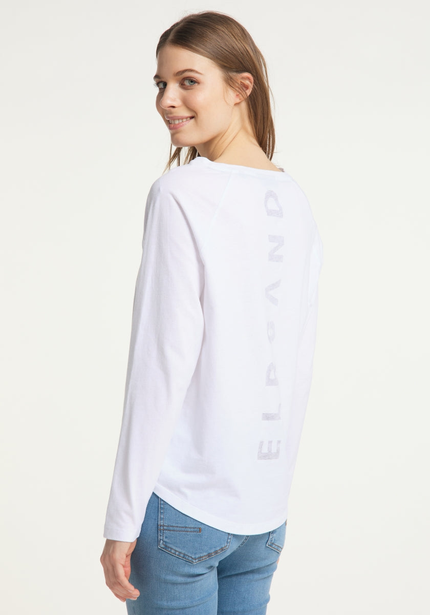 Onze Elbsand Tinna Longsleeve T-shirt is een losvallend shirt met lange mouwen, gemaakt van lichte single jersey kwaliteit met een zachte touch. Dit stijlvolle basic longsleeve heeft een modieuze hals en een afgeronde zoom. Op de achterkant bevindt zich een zachte, halftransparante print die een subtiele highlight toevoegt. Het T-shirt voelt heerlijk zacht aan en is veelzijdig te combineren, ideaal voor dagelijks gebruik, stadswandeling of ontspannen momenten. Samenstelling: 50% katoen, 50% polyester. Wasinstructie: machinewas op 30 graden, fijnwasprogramma, niet geschikt voor de droger. Elbsand staat voor een relaxte, authentieke stijl en comfort, perfect voor vrouwen die op zoek zijn naar een comfortabel en tegelijk stijlvol basic longsleeve.