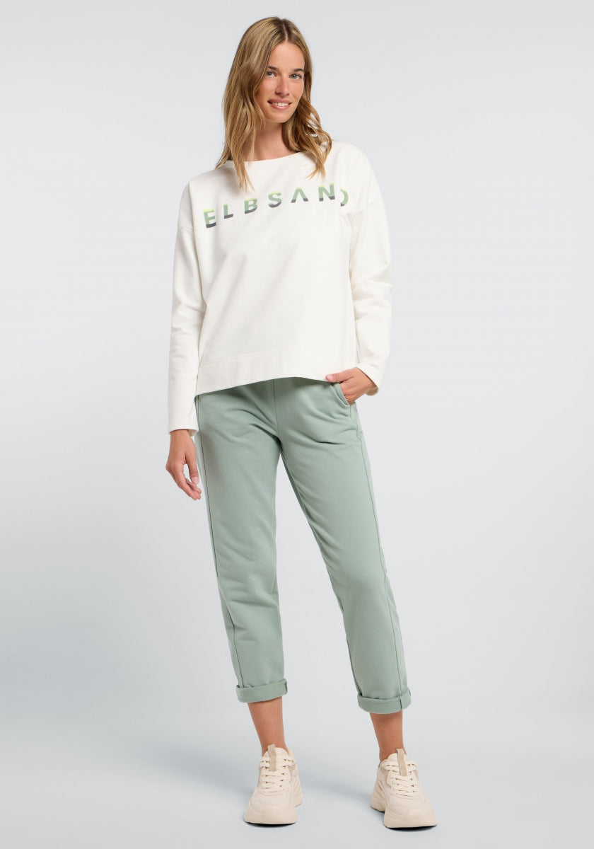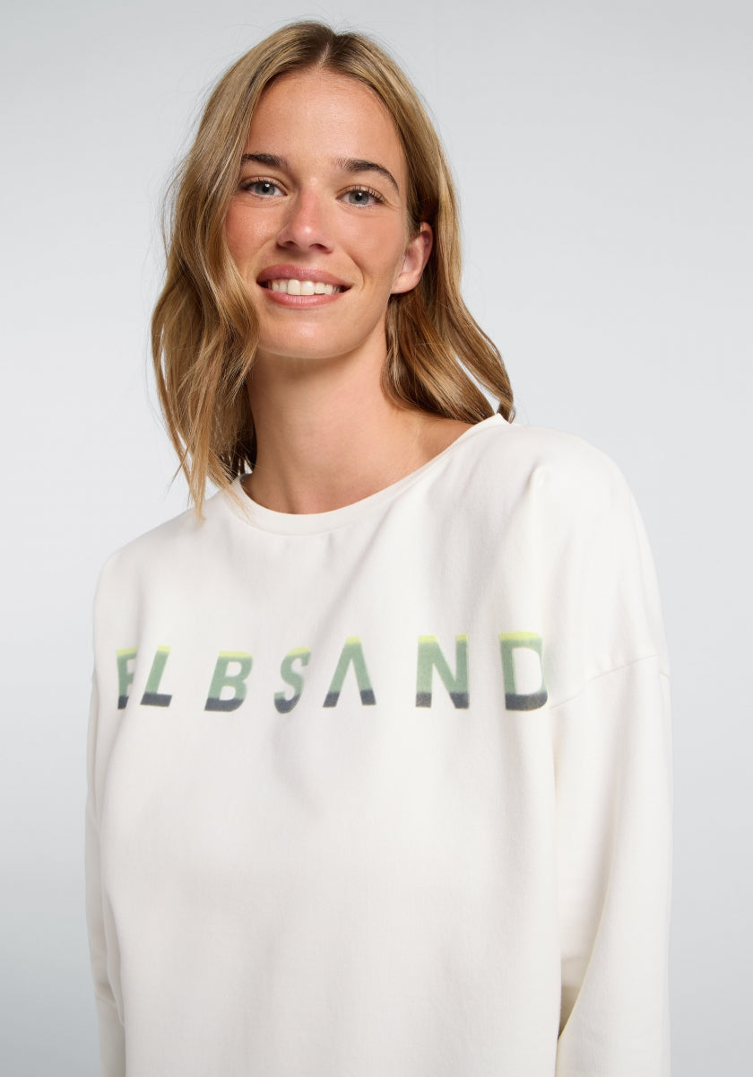 Onze Elbsand Alvar Sweatshirt is een loszittend, comfortabel sweatshirt voor dames. Het bestaat uit 95% katoen en 5% elastaan en biedt dankzij de zachte, elastische sweatstof met een knuffelzachte, geborstelde binnenkant een aangenaam draagcomfort. Het sweatshirt heeft een wijde halslijn, licht overlopende schouders en een brede zoom met zijopeningen, wat het een sportief-vrouwelijke uitstraling geeft. Een zachte flockprint aan de voorkant zorgt voor een moderne, stijlvolle touch. Dit sweatshirt is ideaal voor ontspannen dagen, wandelingen of ontmoetingen met vrienden en is veelzijdig te combineren met jeans of joggingbroeken. Wasvoorschrift: machinewas op 30 graden in een fijnwasprogramma, niet geschikt voor de droger.